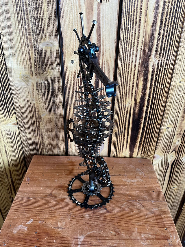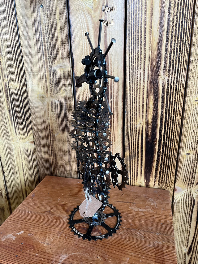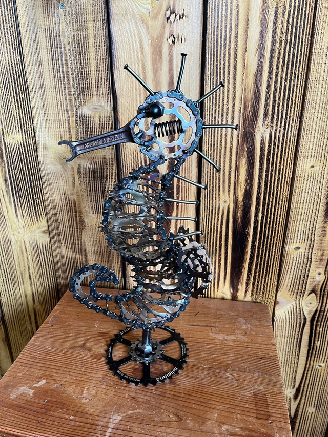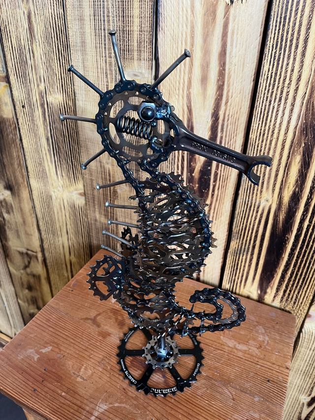 Cet hippocampe a été créé à partir de chaine de vélo, de pignons de vélo, et d'une bielle de moto pour le nez