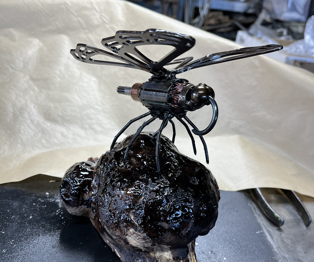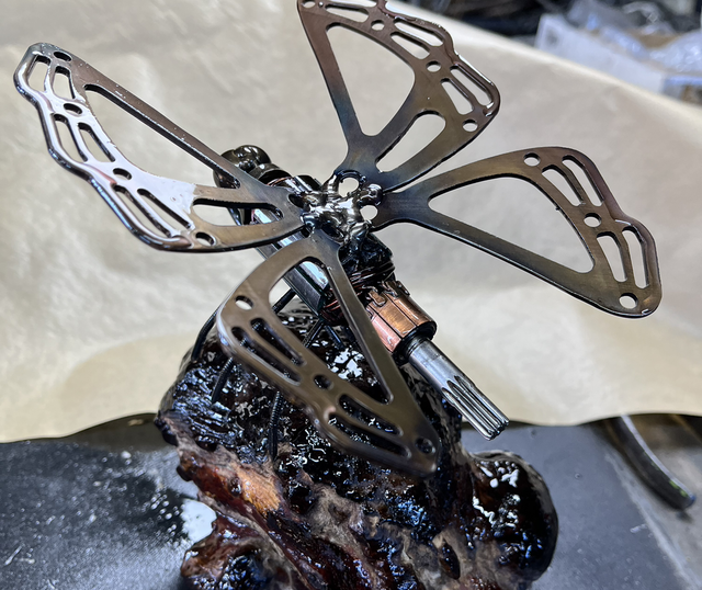 Papillon réalisé à partir d'un disque de frein de vélo, d'un induit de démarreur de petite moto et posé sur une très belle et très rare loupe de bois (châtaignier je pense)