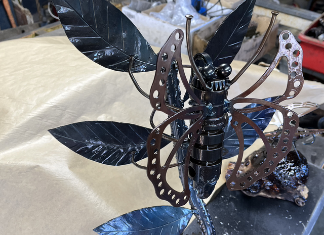 Réalisé à partir de disques de freins de vélo, d'un barillet de boîte de vitesse de moto, d'un guidon de moto et de morceaux d'extincteur pour les feuilles.